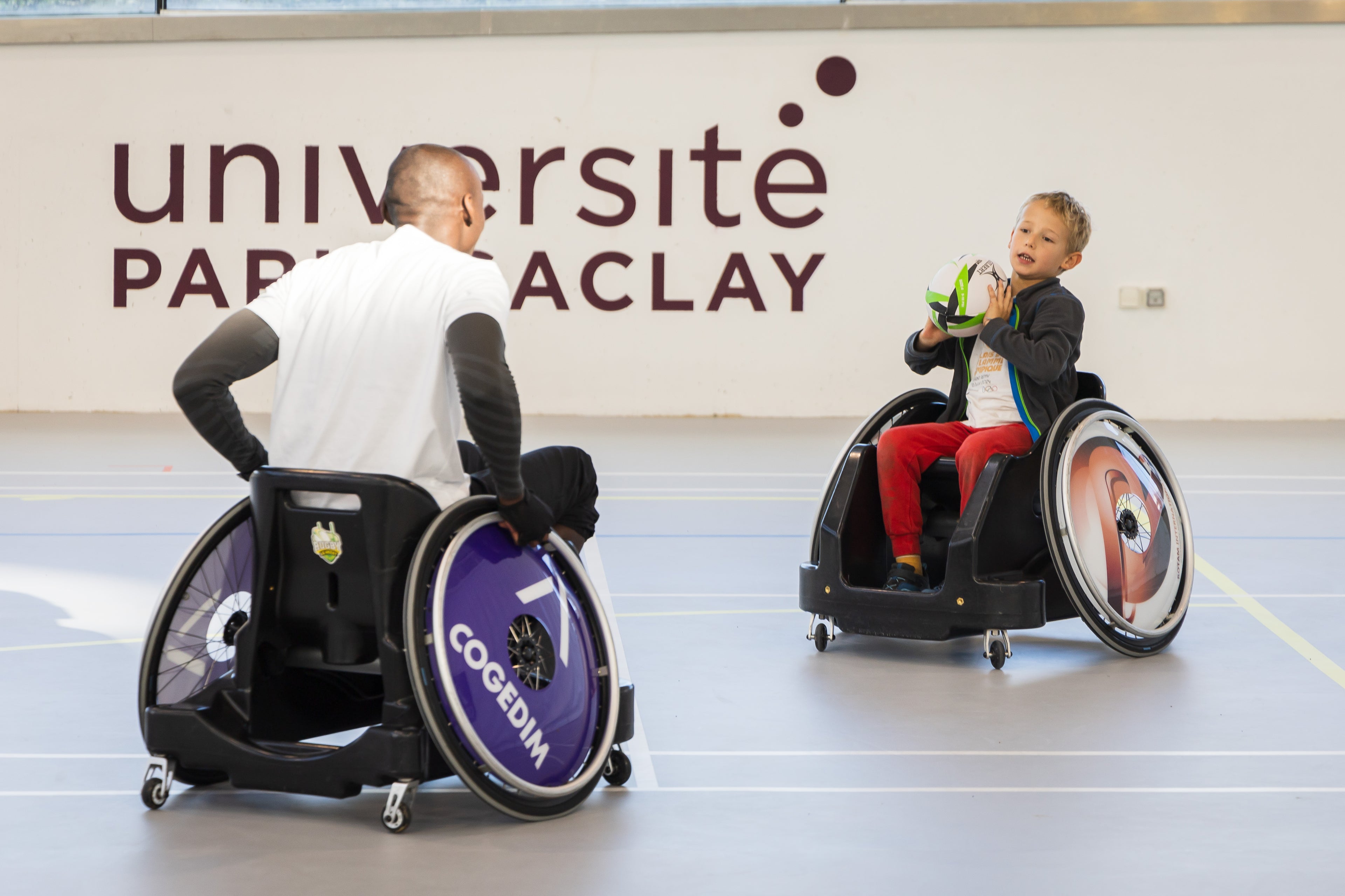 Les pratiquants assis dans un fauteuil de sport, se déplacent sur une surface équivalente à un terrain de handball.